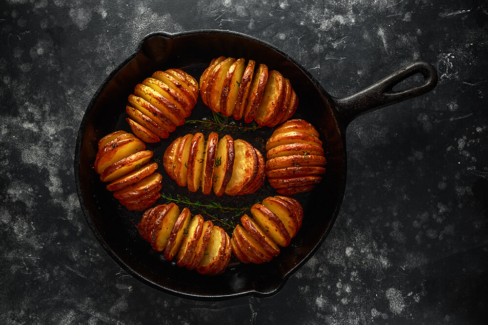 Hasselback potatoes are a type of baked potato where they are cut more than two thirds through into thin fan-like slices while still intact